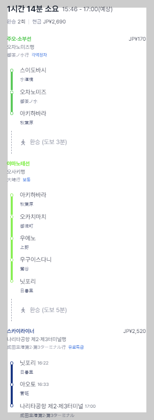 제가 있었던 도쿄돔호텔에서는 스이도바시역(J 주오·소부선)을 타고 아키하바라역에서 내려서 JR 야마노테선을 타고 닛포리까지 갑니다. 거기에서 스카이라이너(일본 고속 열차)를 타고 나리타 공항 제 2·3터미널로 가면 됩니다.